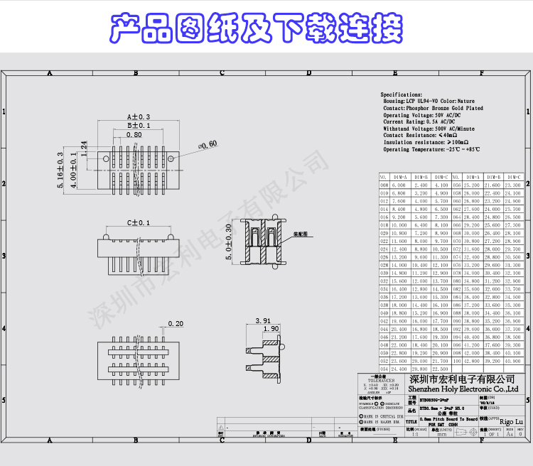 我司主要生產家電連接器,SMT貼片FPC連接器,產品規格從0.3mm、 0.5mm 、1.0mm 、1.25mm、 1.5mm 、2.0MM、2.5mm間距連接器,(FPC排插),板對板 0.5mm 、0.8mm 間距連接器,共四十余種產品,上千種孔位,產品質量無飛邊,無毛刺,全部新料注塑,符合歐盟環保,孔位齊全,尺寸穩定,容易搭配,產品價格合理,如貴司有需要,可以隨時聯系我們,真誠希望能和貴司有合作的機會,http://rigolu.cn.alibaba.com進入公司網址,點擊左側間距目錄可快速精確尋找貴司需要的產品。